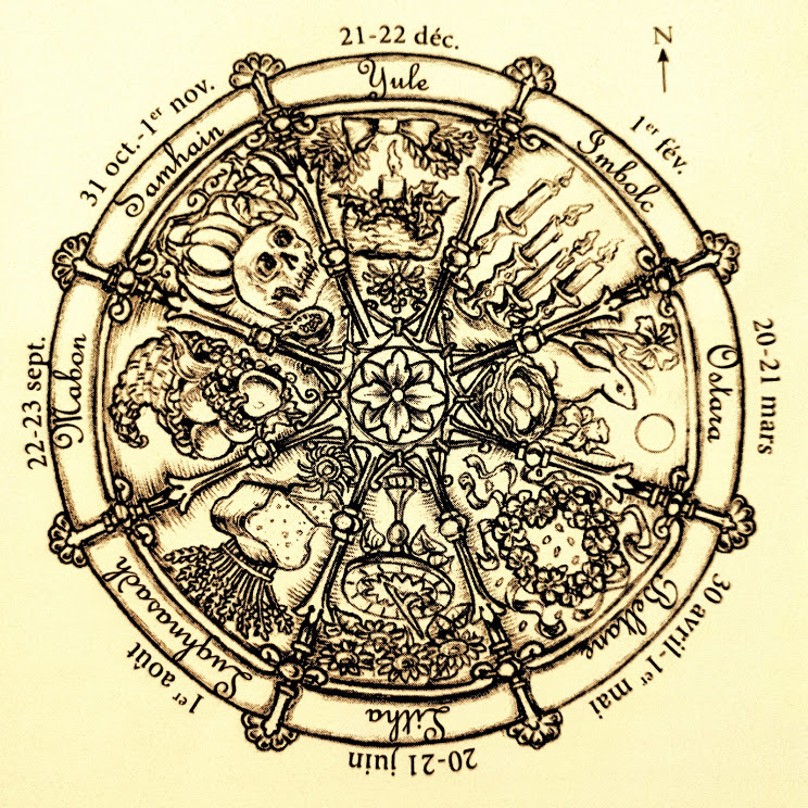 Ces cercles s’ancrent dans les fêtes de la roue de l’année — Samhain, Yule, Imbolc, Ostara, Beltane, Litha, Lughnasadh, Mabon — des passages qui marquent le rythme des saisons, de la lumière et de l’ombre.